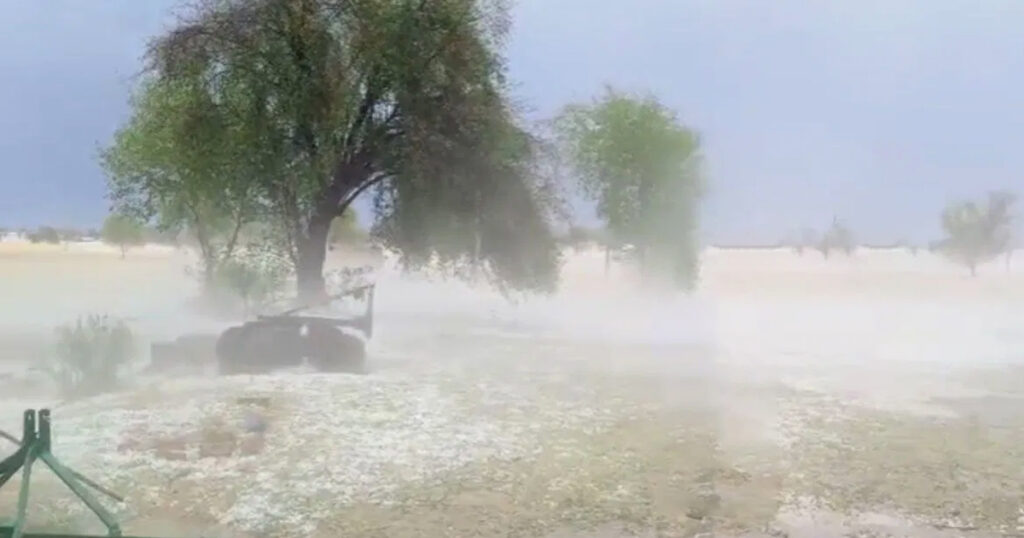 कुछ ही मिनटों में मौसम इतना बिगड़ा कि खेत, सड़कें और घरों के आसपास के इलाके ओलों से ढक गए।